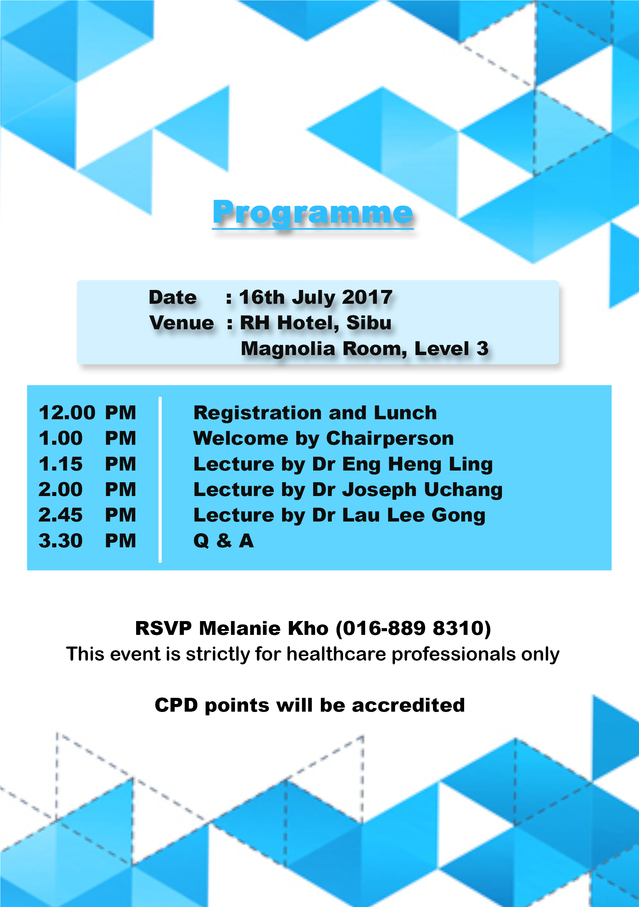 « All Events This event has passed. MMA-CPD Seminar – A GP Update 16 July 2017 @ 12:00 PM - 3:30 PM Free « 15 Minutes For Your Health Tan Chong Express Auto Service – Service Clinic Campaign » + Google Calendar+ iCal Export Details Date: 16 July 2017 Time: 12:00 PM - 3:30 PM Cost: Free Venue RH Hotel Jalan Kampung Nyabor Sibu, Sarawak 96000 Malaysia Phone: +60 84-365 888 Organizer Borneo Medical Centre Phone: +6 082-507 333 Email: admin@borneomedicalcentre.com Website: www.borneomedicalcentre.com